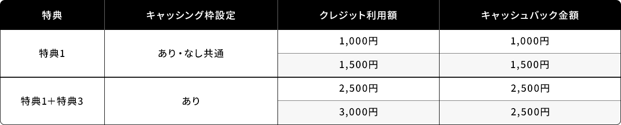 - 「特典3」は「特典1」の金額(1,500円)を超えるショッピング利用に対して、最大1,000円を上限にキャッシュバック(詳細以下)