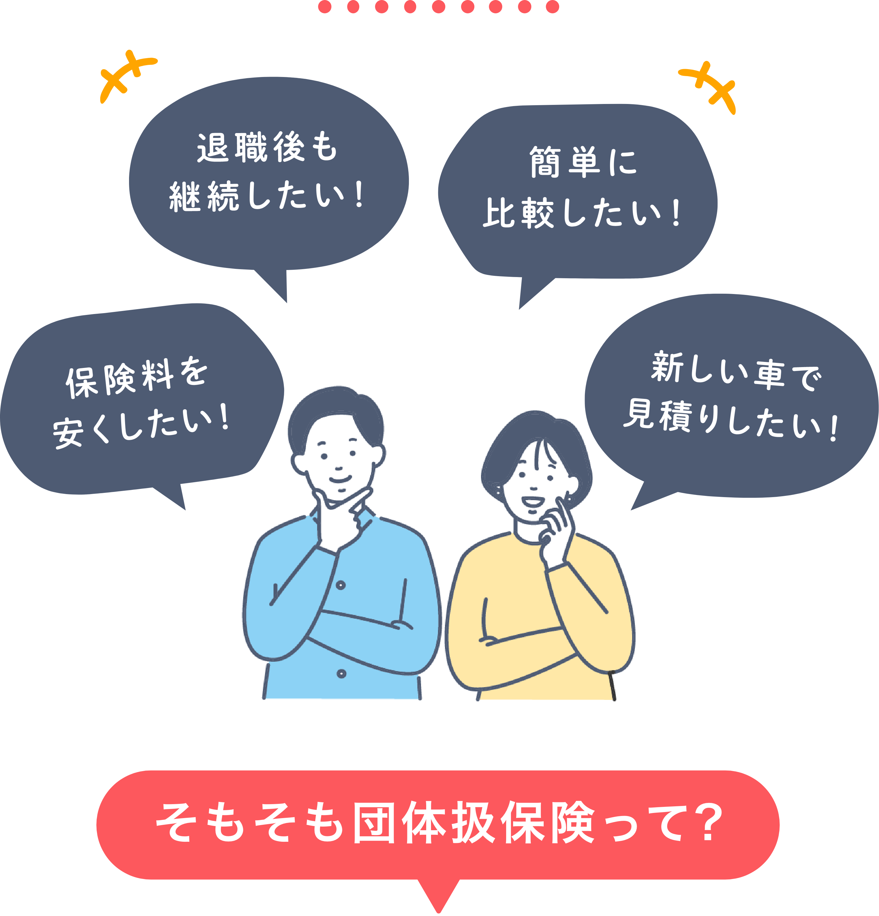 このご案内は商品の概要について紹介したものです。ご契約にあたっては、必ず「重要事項等説明書」をよくお読みください。団体扱の対象となる方の範囲(契約者・記名被保険者・車両所有者)、団体扱特約失効時の取扱いその他ご不明な点などがありましたら取扱代理店、または引受保険会社までお問い合わせください。